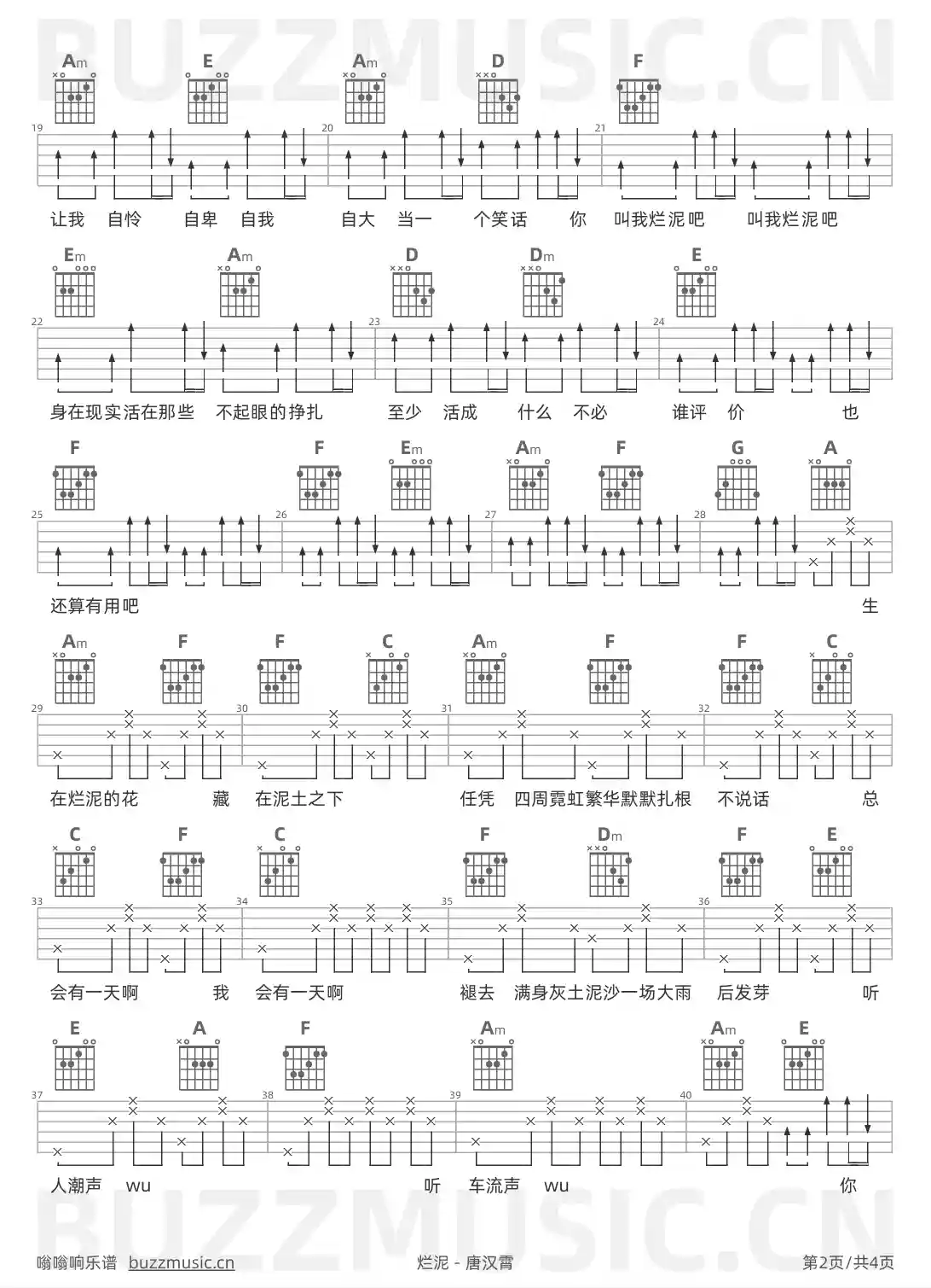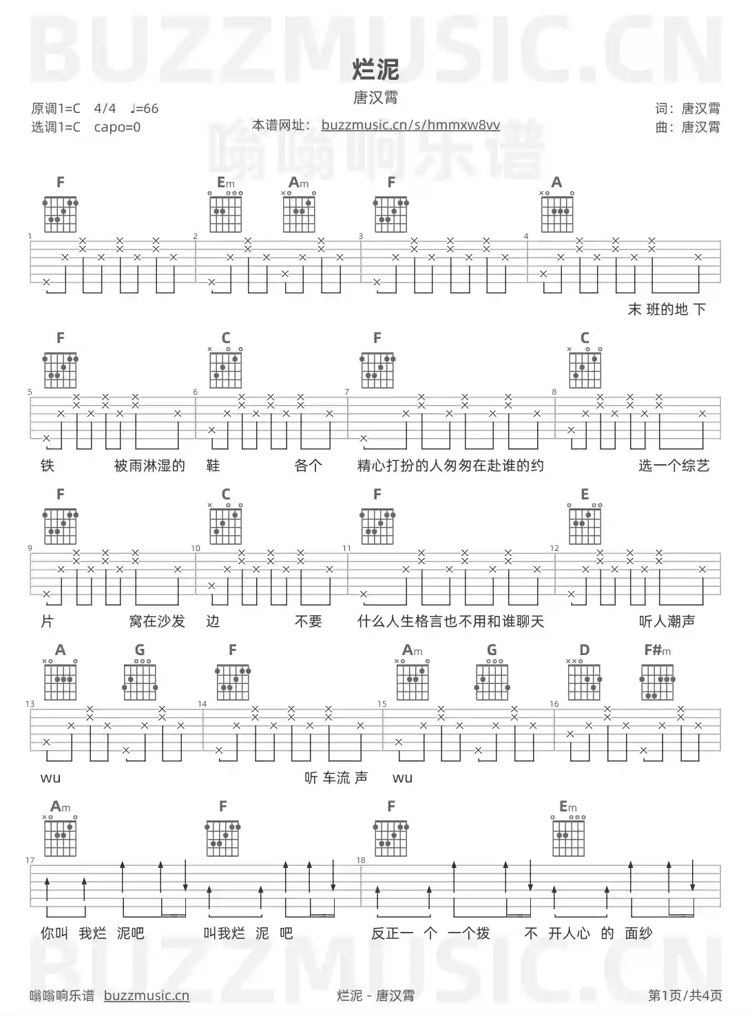 烂泥 唐汉霄 吉他谱C调简单版
